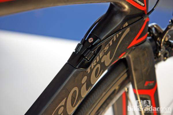 Joining yet another increasingly common trend, the Cento1 SR frame has internal routing for either electronic wires or mechanical cables. This makes the new bike 55 grams lighter than the standard Cento1, but 70 grams heavier than the Cento1 SuperLeggera. Wilier says it’s a fair tradeoff for the SR’s stiffer frame, better handling and improved overall ride.